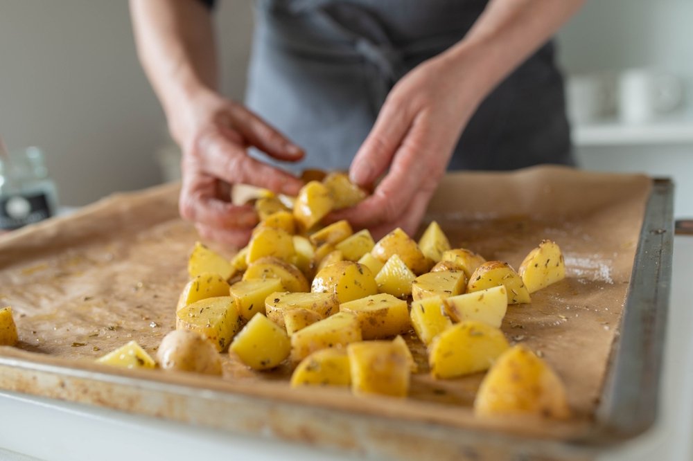 • Arrange the potatoes in a single layer on your baking sheet. Avoid stacking potatoes on top of each other, as this can lead to uneven cooking. Ensure that your sheet pan is spacious enough to accommodate all the potatoes without overcrowding.